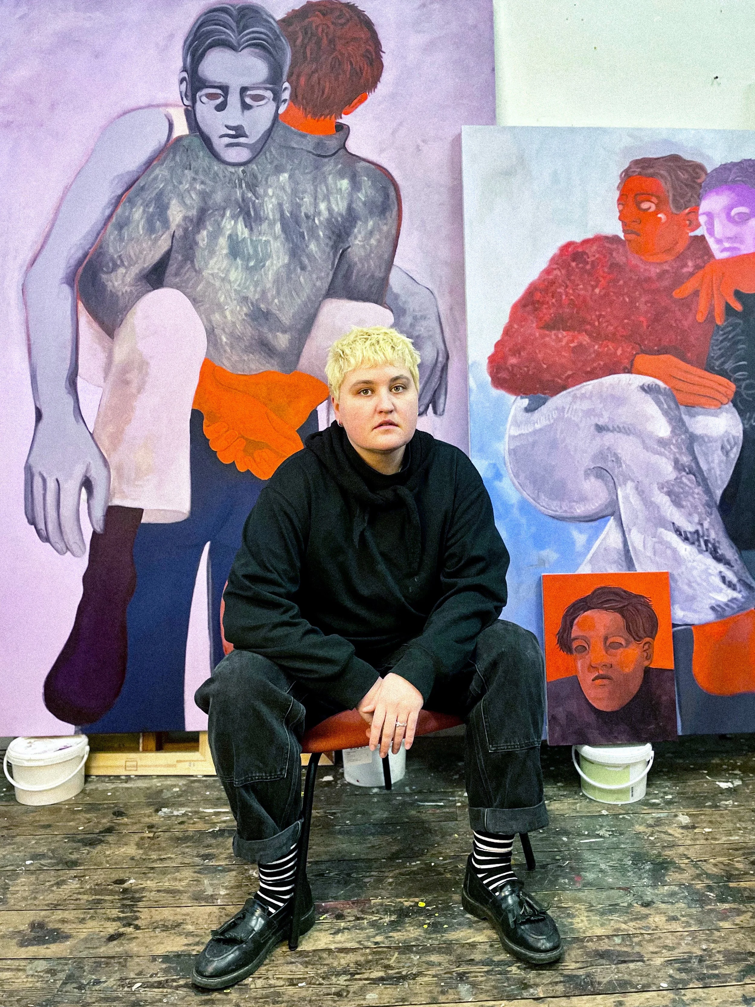 Katja Farin works in figurative painting depicting the interactions between the subconscious and reality. The relationship between figures is uncertain; the everyday life of sitting at coffee shops, wandering in backyard gardens, answering boring phone calls becomes the backdrop for the internal dialogue with the self that contemplates traumas, coping mechanisms, dimensional shifts, dreams and distortions. The works are dream spaces that allow the viewer to peek into the interior worlds of the figures, their relationships with the self and others. Bright colors, emotionally charged expressions and distorted bodies create the dreamlike dysphoric space that these androgynous figures embody. The paintings hold the complexities of emotional and social connection and attempt elucidate the individualistic culture and capitalist realism.